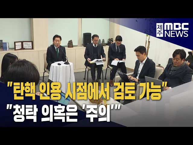 ◀ 앵 커 ▶ 오영훈 제주도지사가 행정체제 개편을 연기하자는 제안에 대해 대통령 탄핵과 조기 대선 시기에 따라 검토할 여지가 있다고 말했습니다. 제주항공 승무원 채용을 청탁했다는 의혹을 받고 있는 정무비서관에게는 주의를 줬다고 밝혔습니다. 조인호 기자입니다. ◀ 리포트 ▶ 한국지방자치학회는 제주형 기초자치단체...