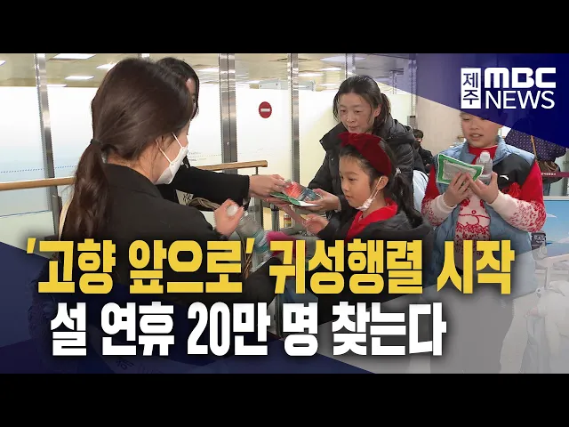 ◀ 앵 커 ▶ 설 연휴를 앞두고 고향을 찾아 가족들과 함께 명절을 보내려는 귀성 행렬이 본격적으로 시작됐습니다. 이번 설 연휴는 예년보다 길고 중국의 춘절 연휴도 겹쳐 관광객들도 제주로 몰려들고 있습니다. 조인호 기자입니다. ◀ 리포트 ▶ 한시간 남짓 하늘을 나는 짧은 여행을 마친 승객들이 제주공항 국내선 대합실...