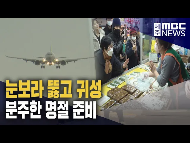 ◀ 앵 커 ▶ 설날을 앞두고 강추위가 몰아친 가운데 눈보라 속에서도 고향으로 돌아오는 귀성객들의 행렬이 이어졌습니다. 명절을 하루 앞둔 재래시장은 차례상을 준비하려는 사람들로 북적였습니다. 조인호 기자입니다. ◀ 리포트 ▶ 설을 앞두고 매서운 겨울 바람이 몰아친 제주공항 눈발이 ...