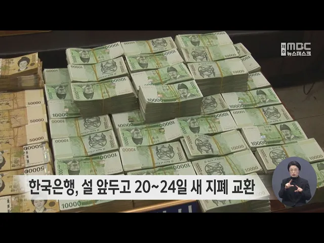 한국은행 제주본부가 설 명절을 앞두고 헌 지폐를 새 지폐로 교환해줍니다. 교환기간은 오는 20일부터 24일까지이며 오만원 권과 만원 권 지폐는 하루에 100만원까지 오천원 권 지폐는 50만원까지 천원 권 지폐는 20만원까지 교환해줍니다. 해당 기간에는 손상된 화폐와 동전 교환 업무는 중단합니다.