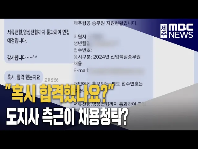 ◀ 앵 커 ▶ 오영훈 제주도지사의 측근인 정무비서관이 제주항공에 승무원 채용을 청탁하는 문자 메시지를 보냈다는 의혹이 제기됐습니다. 해당 비서관은 청탁을 한 사실이 없다고 주장했지만 국민의힘은 오영훈 도지사가 수사를 의뢰하라고 요구했습니다. 조인호 기자입니다. ◀ 리포트 ▶ 오...