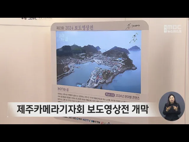 제주카메라기자회 제23회 보도영상전이 개막했습니다. 오는 21일까지 KBS제주방송총국 전시실에서 열리는 보도영상전에서는 제주MBC 등 도내 카메라기자들이 선정한 2024년 10대 뉴스와 특집 프로그램 영상, 제주교육 영상공모전 수상작들이 전시됩니다. 카메라기자들이 선정한 올해의 의원상 수상자인 더불어민주당 김...