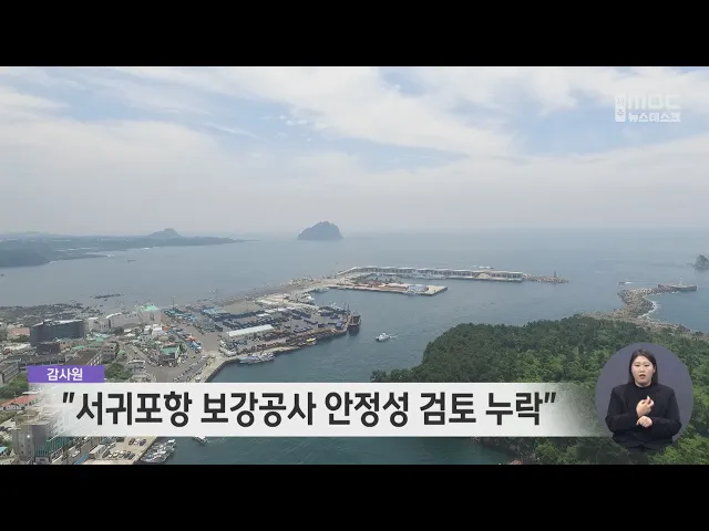 서귀포항 항만시설 보강공사의 안정성 검토가 누락됐다는 감사원 감사 결과가 나왔습니다. 감사원은 서귀포항 방파제 블록을 보강한 공사업체가 구조적 안정성 검토 없이 설계를 변경했는데도 제주도와 해양수산부가 승인하는 바람에 기준치보다 무게보다 적어 태풍 피해가 우려된다고 지적했습니다. 감사원은 또, 제주도가...