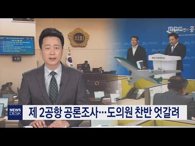 ◀ANC▶ 제 2공항 건설을 둘러싼 찬.반 논란이 갈수록 커지면서 공론조사를 실시할지 여부가 새로운 쟁점으로 떠오르고 있는데요. 제주mbc가 도의원들에게 설문조사를 실시했는데 도의원들 사이에서도 찬.반 의견이 엇갈리는 것으로 나타났습니다. 조인호 기자입니다. ◀END▶ ◀VCR▶ 김태석 도의회 의장은 지난 18일 ...