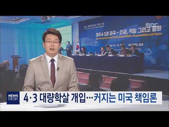 ◀ANC▶ 제주 4.3 사건이 발생한 지 70년이 흘렀지만 대량학살에 직.간접적으로 개입했던 미국은 여전히 침묵으로 일관하고 있는데요. 지금이라도 미국의 책임을 물어야 한다는 목소리가 학계를 중심으로 높아지고 있습니다. 조인호 기자입니다. ◀END▶ ◀VCR▶ 한국전쟁 당시 충청북도 영동군에서 미군이 피난민 300여...