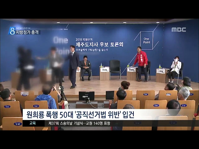 ◀ANC▶ 어제 (그제) 제 2공항 도지사 후보 합동 토론회장에서 발생한 원희룡 예비후보 폭행사건이 이번 지방선거에 미칠 파장에 관심이 쏠리고 있는데요. 원희룡 후보는 가해자의 처벌을 원하지 않는다고 밝혔지만 경찰은 공직선거법 위반 혐의로 입건했습니다. 조인호 기자입니다. ◀END▶ ◀VCR▶ 폭행사건 직후 병...