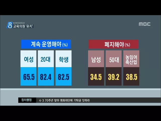 ◀ANC▶ 제주mbc를 비롯한 도내 언론 3사가 실시한 여론조사에서 제주에만 있는 교육의원 제도를 앞으로도 유지해야 한다는 의견이 많은 것으로 나타났습니다. 행정시장은 직선제로 뽑아야 한다는 의견이 많았습니다. 조인호 기자입니다. ◀END▶ ◀VCR▶ 지난 2천 6년 제주 특별자치도 출범과 함께 전국에서 처음으로 ...