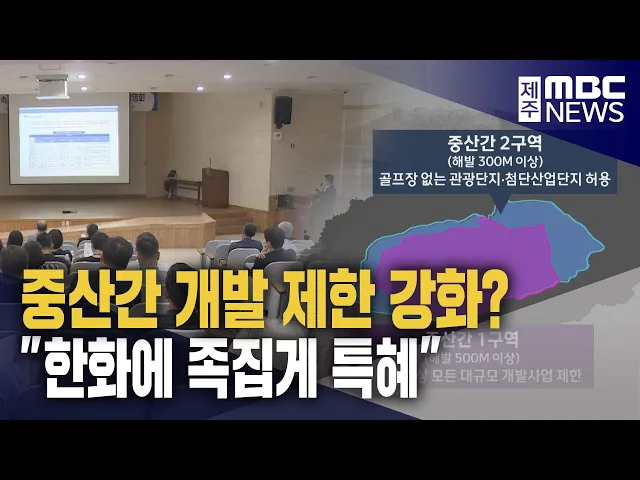 ◀ 앵 커 ▶ 제주도가 중산간 지역의 환경을 보전하겠다며 대규모 개발사업을 제한하는 지속가능한 도시관리계획 기준을 공개했는데요. 새로운 기준이 한화그룹이 중산간 지역에 추진하는 개발사업들을 의식한 족집게 특혜라는 논란이 일고 있습니다. 조인호 기자입니다. ◀ 리포트 ▶ 제주도가 공개한 지속가능한 도시관리계획...