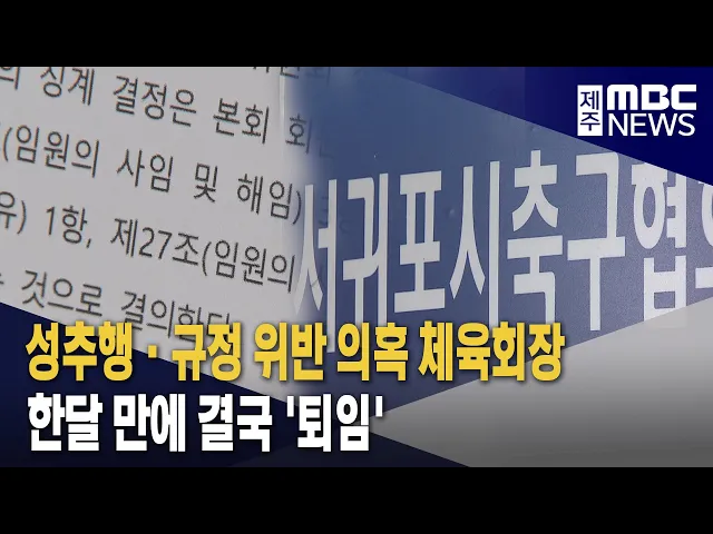 ◀ 앵 커 ▶ 성추행 혐의로 검찰에 넘겨진 뒤 퇴임 규정 위반 의혹을 받고 있는 서귀포시축구협회장이 논란 한 달만에 결국 퇴임 처분됐습니다. 서귀포시체육회는 직원의 단순 실수라며 도의회에 출석해 엉터리 해명까지 했지만 MBC 보도 하루 만에 입장을 바꿨습니다. 박주연 기자가 보도합니다. ◀ 리포트 ▶ 축구협회 회장의...
