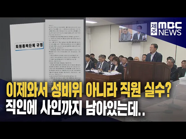 ◀ 앵 커 ▶ 서귀포시 축구협회 회장의 여직원 성추행 의혹과 규정 위반에 대해 서귀포체육회장은 도의회에 출석해 공개 사과는 했지만 직원 실수라며 규정 위반은 부인했는데요. 본인의 직인이 찍힌 징계결정서가 버젓이 있고, 규정도 명백한데, 왜 이런 해명을 내놓는 걸까요? 박주연 기자가 취재했습니다. ◀ 리포트 ▶ 여직...