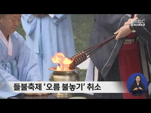 제주들불축제가 오늘부터 나흘간의 일정으로 시작된 가운데 '오름 불놓기' 행사는 취소됐습니다. 제주시는 최근 전국적으로 산불이 잇따르자 불과 관련된 모든 행사를 취소 하기로 결정했고, 구체적인 방침은 내일 밝힐 예정입니다. 한편, 축제 첫날인 오늘은 '희망불씨' 채화 행사가 이뤄졌고, 축제 기간 불이 없는 프로...