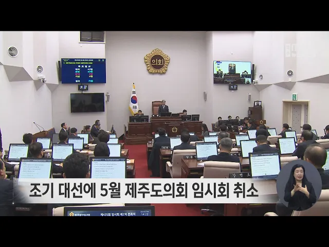 6월 3일 조기 대선으로 다음 달 예정됐던 제주도의회 임시회 일정도 취소됐습니다. 제주도의회 의회운영위원회는 제437회 임시회 회의에서 당초 다음 달 9일부터 15일까지 임시회를 열고 조례안 심사와 현장방문을 진행할 예정이었지만 조기 대선에 따라 취소를 결정했습니다. 다만, 오는 6월 10일부터 25일까지 예정된 임...