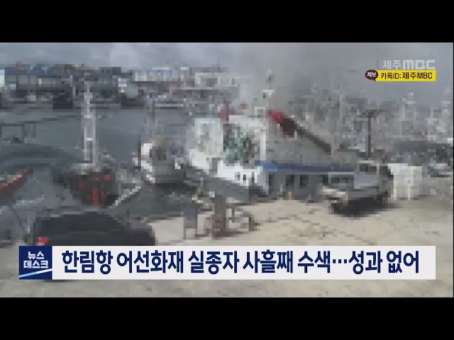 한림항에서 발생한 어선 사고 실종자 수색이 사흘째 이어졌지만 실종자는 발견되지 않고 있습니다. 제주해양경찰서는 그제 한림항에 정박된 어선 3척에서 발생한 화재로 실종된 선원 2명을 찾기 위해 경비함 2척과 경찰과 민간 구조원 20여 명을 투입해 수색하고 있지만 성과는 없었다고 밝혔습니다. 해경은 인양업체를 투...