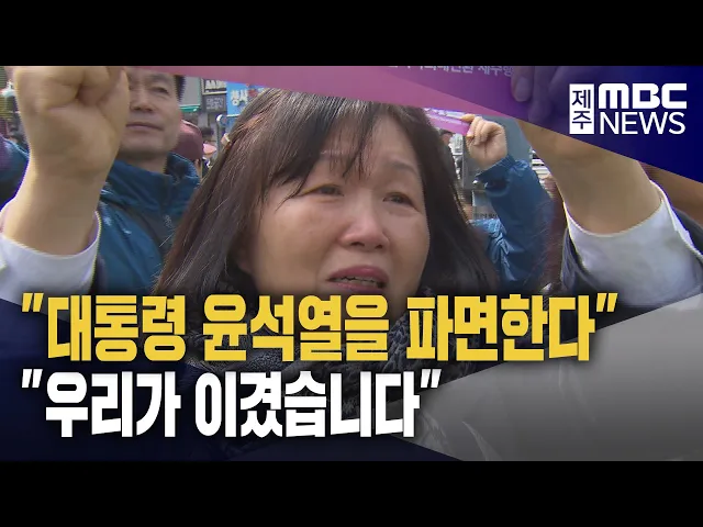 ◀ 앵 커 ▶ 헌정 사상 두 번째로 대통령 탄핵과 파면이라는 역사적인 순간을 제주도민들도 숨을 죽인 채 지켜봤는데요. 도민들은 민심이 반영된 결과라며 이제는 정국 안정으로 장기간 침체됐던 제주지역 경기도 회복되기를 바랐습니다. 박주연 기자입니다. ◀ 리포트 ▶ 탄핵 심판을 지켜보려고 제주 시청 일대에 모인 도민과...