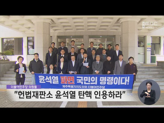 제주도의회 더불어민주당 의원들이 도의회 앞에서 기자회견을 열고 윤석열 대통령에 대한 헌법재판소의 탄핵 인용 결정을 촉구했습니다. 이들은 윤석열 대통령의 헌정 유린과 내란 행위에 대한 탄핵 인용이 국민 주권을 짓밟는 내란 세력에 대한 척결이자 역사적 만행이 되풀이 되지 않도록 하는 헌정사적 교훈이 될 것이라...