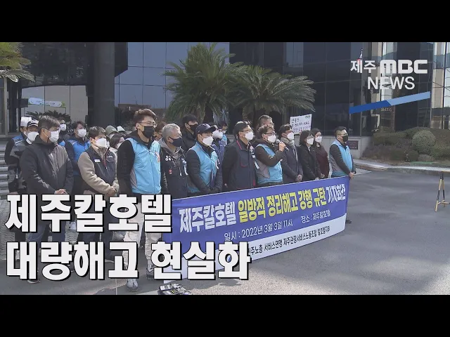 ◀ANC▶ 한 때 제주의 랜드마크로 자리매김하며 40년 역사를 이어온 제주칼호텔. 한진그룹이 매각을 추진하면서 다음달 말이면 운영이 중단되는데요. 100명에 가까운 직원이 감원될 예정인 가운데 직원들은 한진 측이 고용승계 방안에 협의하지 않고 정리해고 절차를 강행하고 있다며 반발하고 있습니다. 박주연 기자가 보...