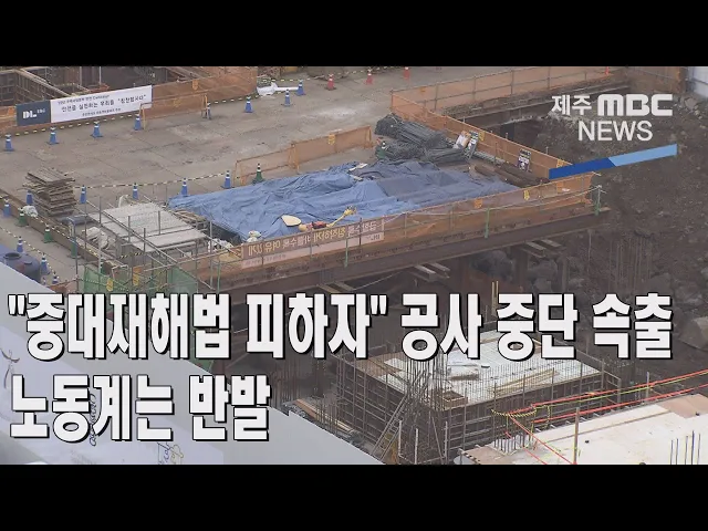 ◀ANC▶ 오늘부터 중대재해처벌법이 시행되자 제주지역에서도 1호 처벌 대상이 되는 것은 피해보겠다며 공사를 중단하는 기업들이 속출하고 있습니다. 노동계는 제주지역 실정에 맞지 않는 법이라며 반발하고 있습니다. 박주연 기자가 보도합니다. ◀END▶ ◀VCR▶ 대형건설회사가 시공하는 제주시내 아파트 신축 공사 ...