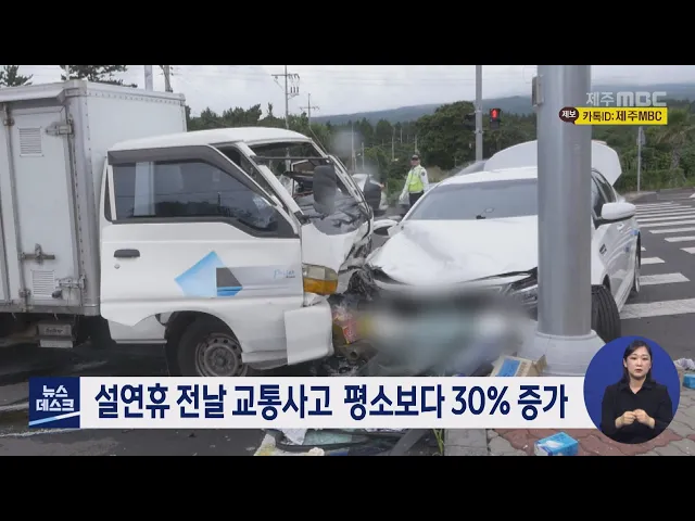 설 연휴 시작 전날 교통사고가 가장 많이 발생한 것으로 나타났습니다. 도로교통공단 제주지역본부에 따르면 지난 2천16년부터 5년 동안 설 연휴 교통사고 통계를 분석한 결과 연휴 시작 전날에 하루 평균 교통사고는 15.2건으로 평소보다 29% 증가했습니다. 또, 교통사고 100건당 사상자 수는 161.5명으로 평소보다 4% 많...