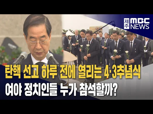 ◀ 앵 커 ▶ 탄핵 정국으로 인한 국정 공백이 장기화 되면서 올해 4·3 추념식에 누가 정부를 대표해 참석할지 궁금증이 높아지고 있는데요. 여야 지도부는 대거 참석할 것으로 보이지만 탄핵 심판 선고 기일이 잡히면서 이번 추념식의 변수가 되고 있습니다. 박주연 기자입니다. ◀ 리포트 ▶ 헌법재판소의 탄핵소추 기각으로 ...