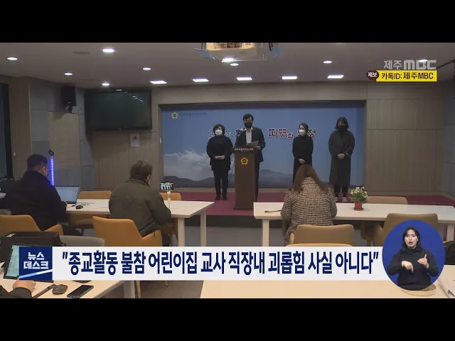 제주시내 모 어린이집에서 종교활동에 참여하지 않은 교사가 직장내 괴롭힘을 당했다는 주장과 관련해 해당 어린이집이 사실이 아니라고 해명했습니다. 어린이집 측은 제주도의회에서 기자회견을 갖고 종교활동 참석에는 강제성이 없었는데도 노조가 잘못된 내용을 주장하며 대화를 받아들이지 않아 갈등의 골을 깊게 만들...