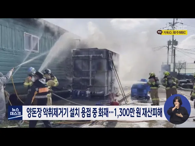 오늘 오후 1시 반쯤제주시 한림읍 한 양돈장에서 불이 나돈사 외벽 일부와 악취제거기 한 대를 태워천300여 만 원의 재산피해가 났지만인명피해는 없었습니다. 경찰과 소방당국은양돈장 외부에서악취제거기를 설치하기 위해용접작업을 하던 중불티가 기계 내부에 번져 불이 난 것으로 보고 정확한 화재 원인을 조사하고 있...