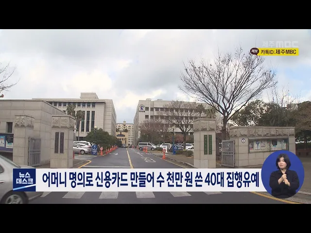 제주지방법원 형사1단독 심병직 부장판사는어머니 개인정보로 신용카드를 만들어수천만 원을 사용한 혐의로 기소된44살 김 모씨에게 징역 6월에집행유예 1년을 선고했습니다. 김씨는 지난 2천18년 8월,자신의 어머니의 개인정보로 만든신용카드로 400여 차례에 걸쳐현금을 인출하거나 물건을 구입해5천900여 만 원을 가로...