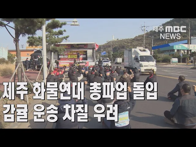 ◀ANC▶ 화물연대가 전국적으로 총파업에 들어간 가운데제주지역 일부 화물차 기사들도파업에 참여했습니다. 아직까지 물류에 큰 차질은 빚어지지 않고 있지만수확철을 맞은 감귤 운송에 차질이 빚어질까 우려되고 있습니다. 박주연 기자입니다. ◀END▶ ◀VCR▶ ◀SYN▶ \"(안전운임제) 일몰제 폐지하라 일몰제 폐지...