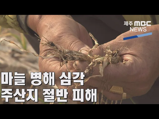 ◀ANC▶ 지난달 잦은 비날씨에 마늘 종자가 썩고,파종한 마늘도 제대로 자라지 못해농가들이 애를 태우고 있다는 소식,얼마전 전해드렸는데요, 최근에는 병해까지 번져주산지인 서귀포시 대정읍과 안덕면 지역 마늘 경장지 절반 가량이 피해를 입었습니다. 박주연 기자가 취재했습니다. ◀END▶ ◀VCR▶ 초록빛 잎이 무...