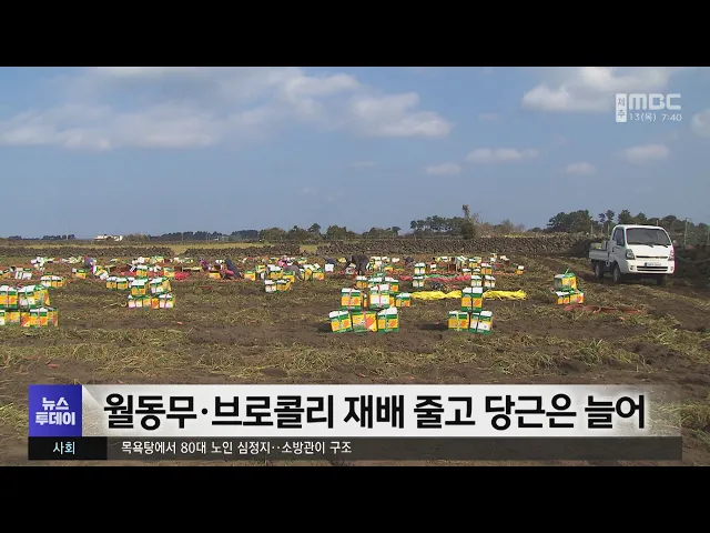 월동무와 브로콜리 재배면적은 줄고, 당근은 늘어난 것으로 관측됐습니다. 제주도가 지난해 10월부터 도내 농경지 5만 5천헥타르의 월동채소 재배현황을 조사한 결과 월동무는 작년보다 9.1%, 브로콜리는 5.8% 줄어든 것으로 조사됐습니다. 반면 당근은 18.6%, 양배추는 0.2% 증가했는데, 수확작업의 어려움과 가격 호조에 ...