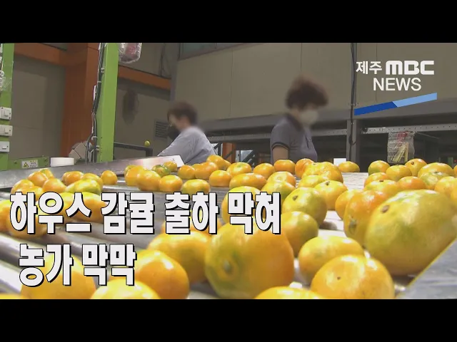 ◀ANC▶추석 명절을 앞두고 하우스 감귤 출하가 한창 이뤄져야 할대목을 맞았는데요,하지만 올해는 경매시장에 코로나19가 확산되고,태풍으로 해상 운송길 마저 막혀 농가들이 애를 태우고 있습니다.박주연 기자가 취재했습니다.◀END▶◀VCR▶서귀포지역의 한 농협 유통센터.한 쪽에 상자에 담긴 하우스감귤이잔뜩 쌓여...