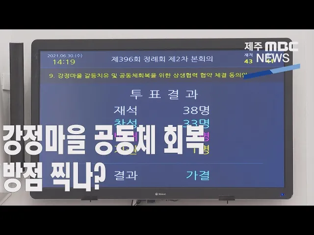 ◀ANC▶ 해군기지 건설로 갈등을 겪은 서귀포 강정마을을 치유하고 공동체 회복을 위한 상생협력 협약 체결 동의안이 도의회를 통과했습니다. 해군기지 건설 과정에서 발생한인권침해 진상규명을 촉구하는 결의안도 채택됐는데요, 하지만 해군기지 반대 주민들은상생협약 전에 진상조사를 통한 명예회복이 먼저라며 반발...