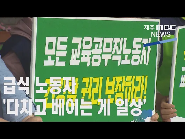 ◀ANC▶ 학교 급식 노동자가 음식물 감량기를 청소하다 손가락이 잘리는 사고를 당해 이석문 제주도교육감을 상대로 손해배상소송을 제기한 소식, 어제 전해드렸는데요. 급식 노동자들은 최근 코로나19로 음식 조리 외에 방역 위생관리까지 업무가 더 늘어났지만 인력배치 기준 때문에 아파도 휴가를 못내고 일을 해야하...