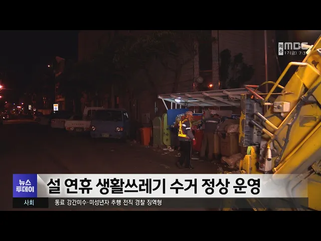 설 연휴에도 생활쓰레기 수거가 정상적으로 이뤄집니다. 제주도는 설 연휴 명절 음식과 선물 포장 등으로 평소보다 많은 쓰레기가 발생함에 따라 오는 25일부터 엿새 동안 청소 차량을 정상 운영한다고 밝혔습니다. 특히, 설 전날인 28일 밤 10시부터 다음달 오전 7시까지 추가 인력을 투입하고 특별감시활동을 위한 환...