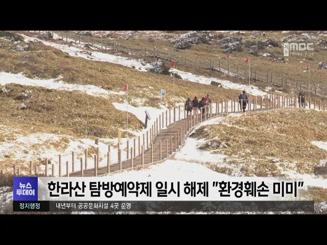 한라산 탐방예약제를 하지 않아도 자연환경 훼손이 심하지 않은 것으로 조사됐습니다. 제주도는 탐방예약제가 해지된 상태에서 최근 한 달 동안 모니터링을 한 결과 훼손 정도가 미미하고, 일부 탐방로에서 확인된 뿌리 노출 등도 직접적인 영향이 아닌 것으로 분석했습니다. 탐방예약제 해제로 한라산 탐방객은 작년보다 1...