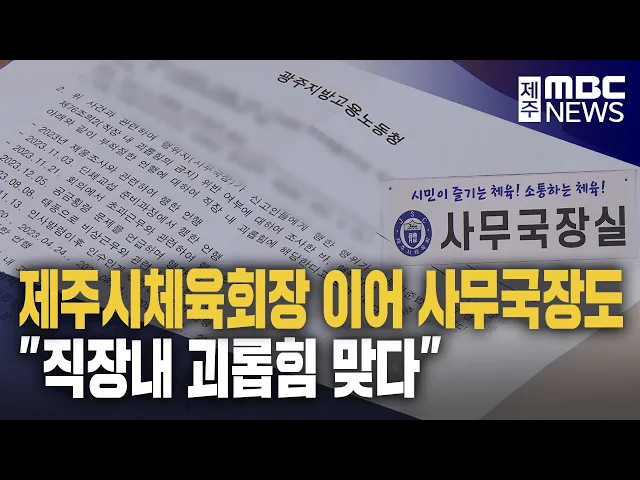 ◀ 앵 커 ▶ 제주MBC는 최근 이병철 전 제주시 체육회장에 이어 체육회 사무국장의 직장 내 괴롭힘 의혹에 대해 보도해 드렸는데요. 고용노동부가 5개월 동안 조사한 결과, 직장 내 괴롭힘 11건이 인정됐습니다. 박주연 기자가 취재했습니다. ◀ 리포트 ▶ 지난 7월 MBC가 보도한 제주시체육회 사무국장의 직장 내 괴롭힘 ...