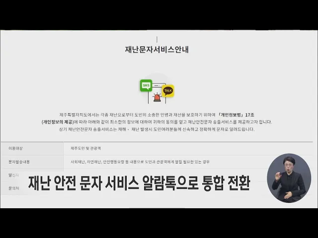 내년부터 재난안전 문자 서비스가 알람톡으로 통합 전환됩니다. 제주도는 기상정보와 교통통제상황, 수어 동영상 등 취약계층을 위한 다양한 부가정보를 링크 버튼을 통해 제공할 수 있는 알림톡으로 통합 전환한다고 밝혔습니다. 제주도는 건당 송출비용도 24원에서 5원으로 줄일 수 있어 실시간 재난정보 소통채널을 ...