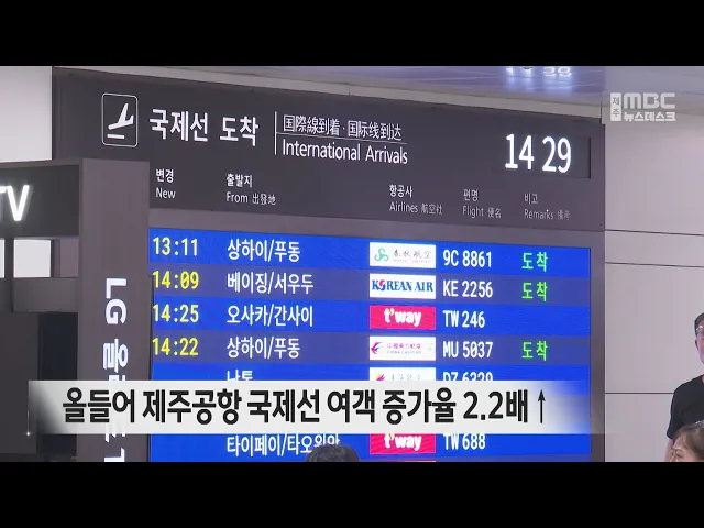 제주를 찾은 국제선 항공편 이용객이 지난해보다 갑절 이상 늘어난 것으로 나타났습니다. 국토교통부 항공통계에 따르면 올들어 지난달까지 제주공항 국제선 여객은 210만 천600여 명으로 지난해 같은 기간 94만 6천여 명보다 2.2배 늘었습니다. 제주공항 국제선 여객 증가율은 인천 공항을 제외한 7개 지방공항 가운데,...