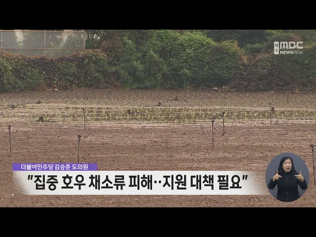 최근에 발생한 집중호우로 인한 채소류 피해에 대해 조속한 피해 조사와 지원이 필요하다는 지적이 도의회에서 제기됐습니다. 더불어민주당 김승준 도의원은 내년 제주도 예산 심사에서 브로콜리와 양배추, 콜라비 등의 채소류가 집중호우로 침수피해를 입어 무름병과 시드름병이 급격히 증가해 피해가 확산되고 있다며 ...
