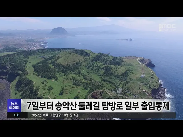 송악산 둘레길 탐방로에 대한긴급 보수가 이뤄집니다. 서귀포시는오는 7일부터 다음달 말까지1전망대부터 데크 종점까지700m구간에 대해긴급 보수를 진행하기 위해출입을 통제한다고 밝혔습니다. 많은 탐방객들의 발길과 바닷바람으로 송악산 탐방로에 설치된 데크가 수명이 짧아 일부 구간씩 정비하고 있는데,탐방객의 불...