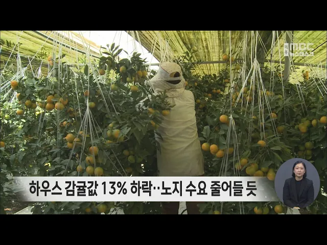올해 하우스 감귤값이 크게 떨어졌습니다. 한국농촌경제연구원에 따르면지난달 하우스온주 가락시장 도매가격은3kg에 2만 2천400원으로지난해 같은 기간보다 13% 하락했습니다.농촌경제연구원은생산량이 15% 넘게 줄었지만품질 저하와 대체 과일이 늘면서 소비가 줄어든 것으로 분석했습니다.한편, 수확을 앞둔노지 감귤 예...