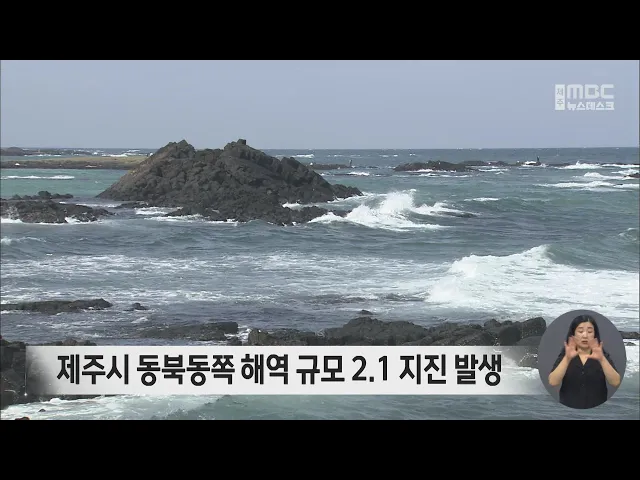 오늘 오전 11시 33분쯤 제주시 동북동쪽 40km 해역에서 규모 2.1의 지진이 발생했습니다. 기상청은 진원 발생 깊이는 16km로, 지진 피해는 없을 것으로 예상했으며 119에 지진 관련 신고도 접수되지 않았습니다. 이번 지진을 포함해 올들어 제주해역에서 규모 2.0 이상의 지진이 다섯 차례 발생했습니다.