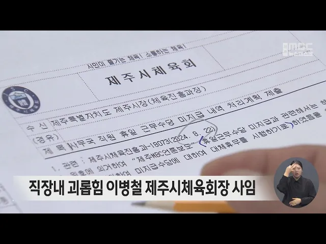 직장내 괴롭힘으로 논란을 빚었던 이병철 제주시체육회장이 오늘 사임했습니다. 제주시체육회에 따르면 오늘 오전 이병철 제주시체육회장이 회장직에서 물러나겠다며 사퇴서를 제출했습니다. 이병철 회장은 고용노동부 조사 결과, 직장내 괴롭힘으로 12건이 인정돼 과태료 500만 원이 부과됐고 직원들의 휴일 수당 미지...