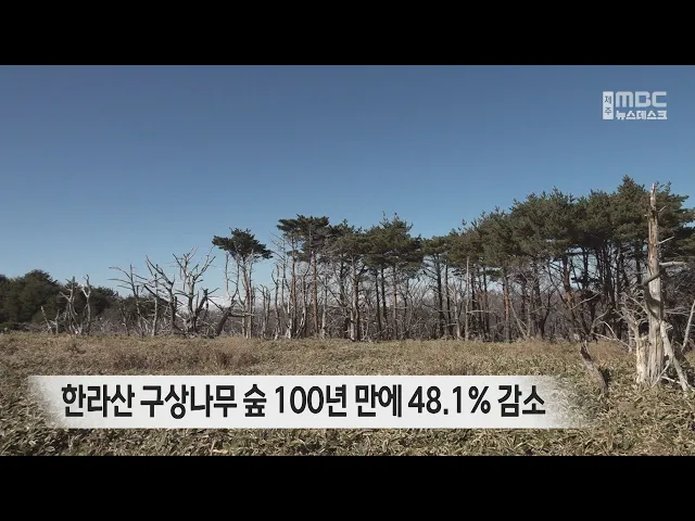 100년 동안 한라산 구상나무 숲의 면적이 절반 가까이 줄었다는 연구 결과가 나왔습니다. 제주도 세계유산본부는 한라산 구상나무 숲의 100여 년 간의 분포 변화를 조사한 결과, 천918년 천168.4헥타르에서 2천21년 606헥타르로 562.4헥타르, 48.1%가 감소했습니다. 축구장 787개 면적의 구상나무 숲이 사라진 것인데, ...