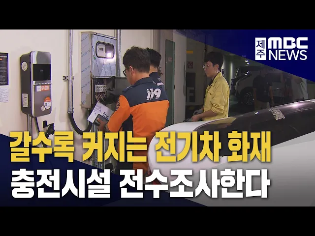◀ 앵 커 ▶ 전기차 화재가 잇따르면서 전국에서 보급률이 가장 높은 제주지역도 전기차 화재에 대한 우려가 커지고 있는데요. 전기차 충전시설에 대한 합동 점검이 이뤄졌습니다. 점검 현장을 박주연 기자가 취재했습니다. ◀ 리포트 ▶ 아파트 지하주차장에서 벤츠 전기차가 불에 타더니 주차장 전체가 화염에 휩싸입니다. 이...