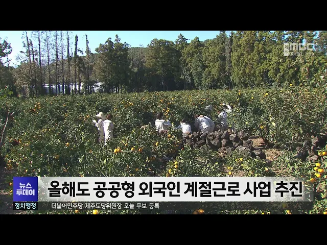 일손이 부족한 농가 지원을 위해공공형 외국인 계절근로 사업이 올해도 추진됩니다. 제주시는베트남 출신 공공형 외국인 계절근로자 30명을 선발했고,오는 10월부터 필요한 지역 농가에 투입하기로 했습니다. 공공형 외국인 계절근로사업은 지난해 서귀포시 위미농협에서 처음으로 사업이 추진됐는데, 외국인 노동자들이 ...
