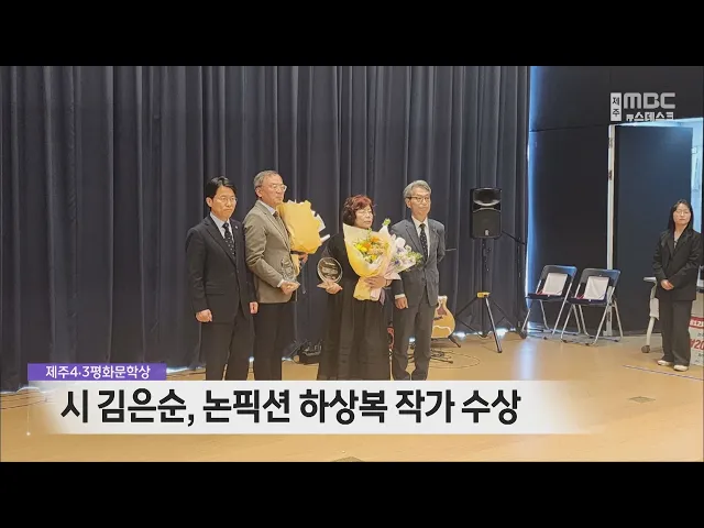 제12회 제주4.3평화문학상 시상식이 제주문학관에서 열렸습니다. 제주도와 4.3평화재단이4.3의 진실, 인류의 보편적 가치인 평화와 인권'을 주제로 공모한 결과 시 부문에서는 '사월은 예감도 예고도 없이'를 쓴 김은순 시인이,논픽션 부문에서는 '칼라스의 전사 관용의 사상가, 볼테르'를 쓴 하상복 작가가 수상했습니다....