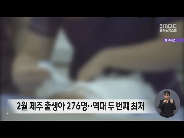 제주지역 출생아 수가 급감하며역대 두 번째로 적은 수치를 기록했습니다. 통계청에 따르면지난 2월 제주지역 출생아 수는 276명으로1981년 관련 통계 작성 후2월 출생아로는 두 번째로 적었습니다.인구 천 명당 출생아 수를 의미하는조출생률도 5.2명으로1년 전보다 0.1명 줄었습니다.한편, 사망자 수는 412명으로 출생아...