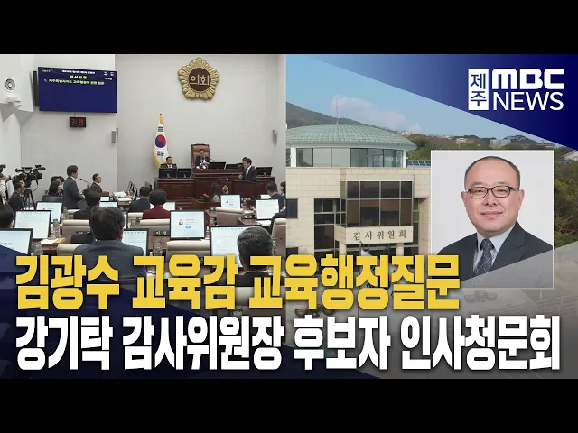 ◀ 앵 커 ▶이번주에도 제주도의회 임시회에서 김광수 교육감을 상대로 한교육행정질문과 조례안 심사가 진행됩니다. 강기탁 감사위원장 후보자의 인사청문회도 오는 25일 열립니다. 이번주 주요 일정을박주연 기자가 보도합니다. ◀ 리포트 ▶지난주에 개회했던제주도의회 제426회 임시회가오는 26일까지 이어집니다.지난 19일...