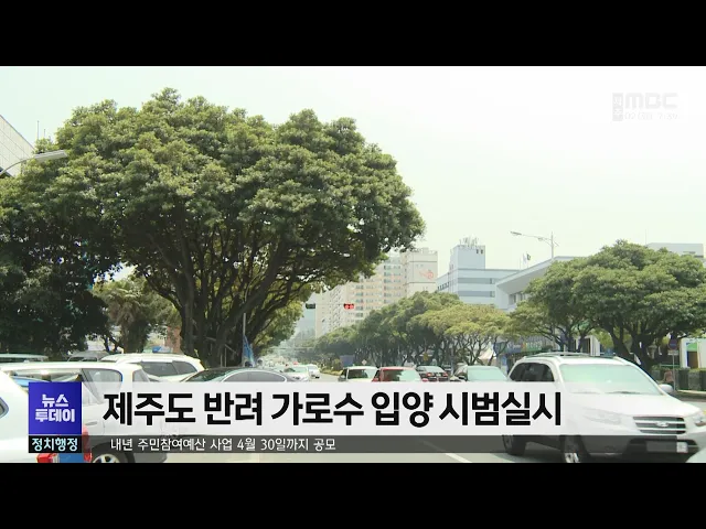 가로수를 반려동물처럼 입양하는 시범사업이 제주에서도 이뤄집니다. 입영 대상 가로수는 국립제주박물관에서 사라봉 입구, 롯데마트 사거리에서 한화아파트 사거리, 제주시민복지타운 광장 등 모두 6곳의 2천660m 구간에 있는 나무들로 신청한 기업과 기관, 단체를 대상으로 심사를 거쳐 입양이 결정됩니다. 가로수를 입양...