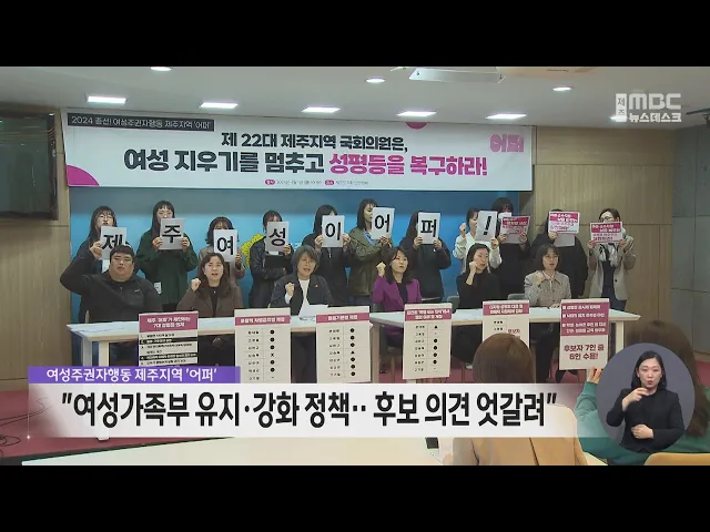 여성주권자행동 제주지역 '어퍼'가 총선 후보자들에게 여성가족부 유지와 강화 등을 질의한 결과 민주당 문대림, 위성곤 후보와 녹색정의당 강순아 후보는 수용 입장을 전했습니다. 민주당 김한규 후보는 인구 위기 전담부처로 위상 제고가 필요하다며 조건부 수용 입장을 전했고, 국민의힘 고광철, 김승욱 후보는 불수용, ...